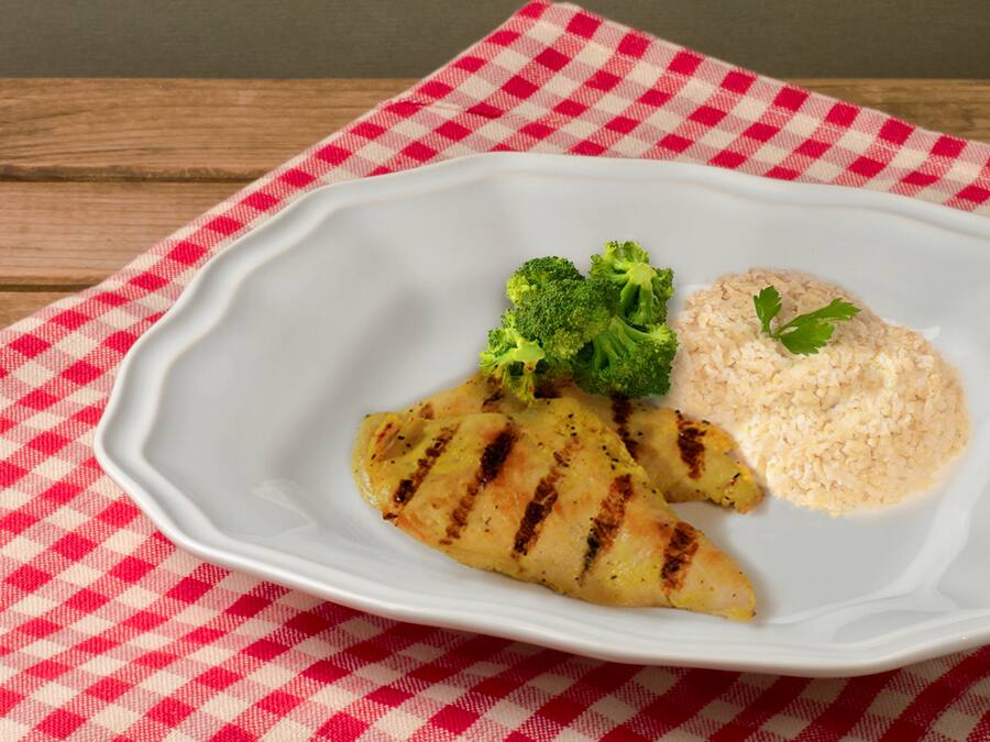 Produto comercializado congelado - Ingredientes: Peito de frango, arroz integral, brócolis, azeite extra virgem, alho, sal do himalaia, açafrão da terra, pimenta do reino. Alérgicos: Não Contém Glúten 323 Kcal. Imagem ilustrativa.